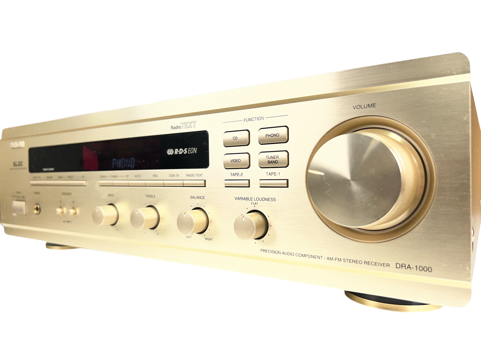 Denon DRA-1000 stereo receiver fra slutten av 1990-tallet. Kraftig forsterkerdel kombinert med analog FM/MW-tuner, bygget som et rendyrket stereoalternativ i en overgangstid mot hjemmekino. En ryddig og funksjonell receiver med tydelig 90-talls hi-fi-preg.