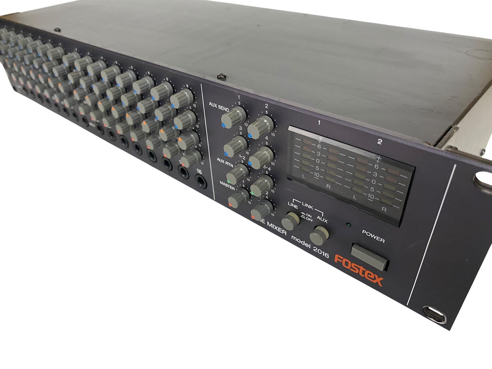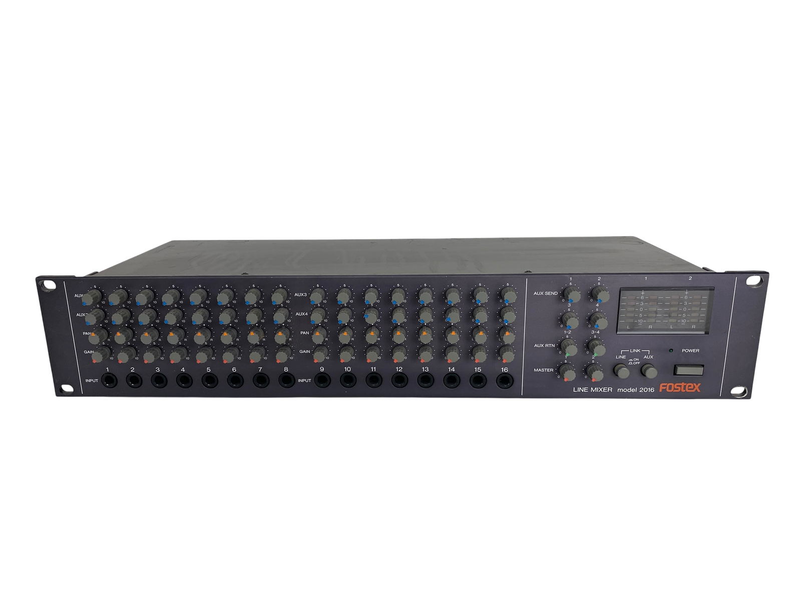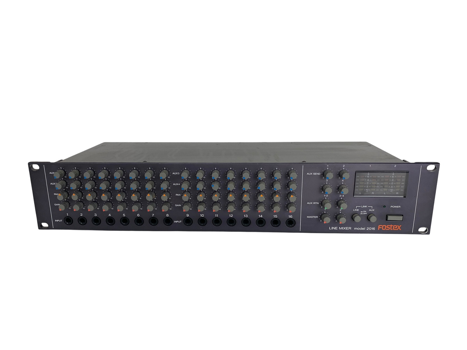 The Fostex 2016 is a 16-channel, rackmountable analog line mixer designed for studio and live applications. It features 16 line-level inputs with level and pan controls, four auxiliary sends, and a clean, transparent signal path. Housed in a 2U rack case, it offers flexible routing options, including the ability to split into two stereo mixers, making it ideal for keyboard sub-mixing, effects returns, or expanding auxiliary sends.