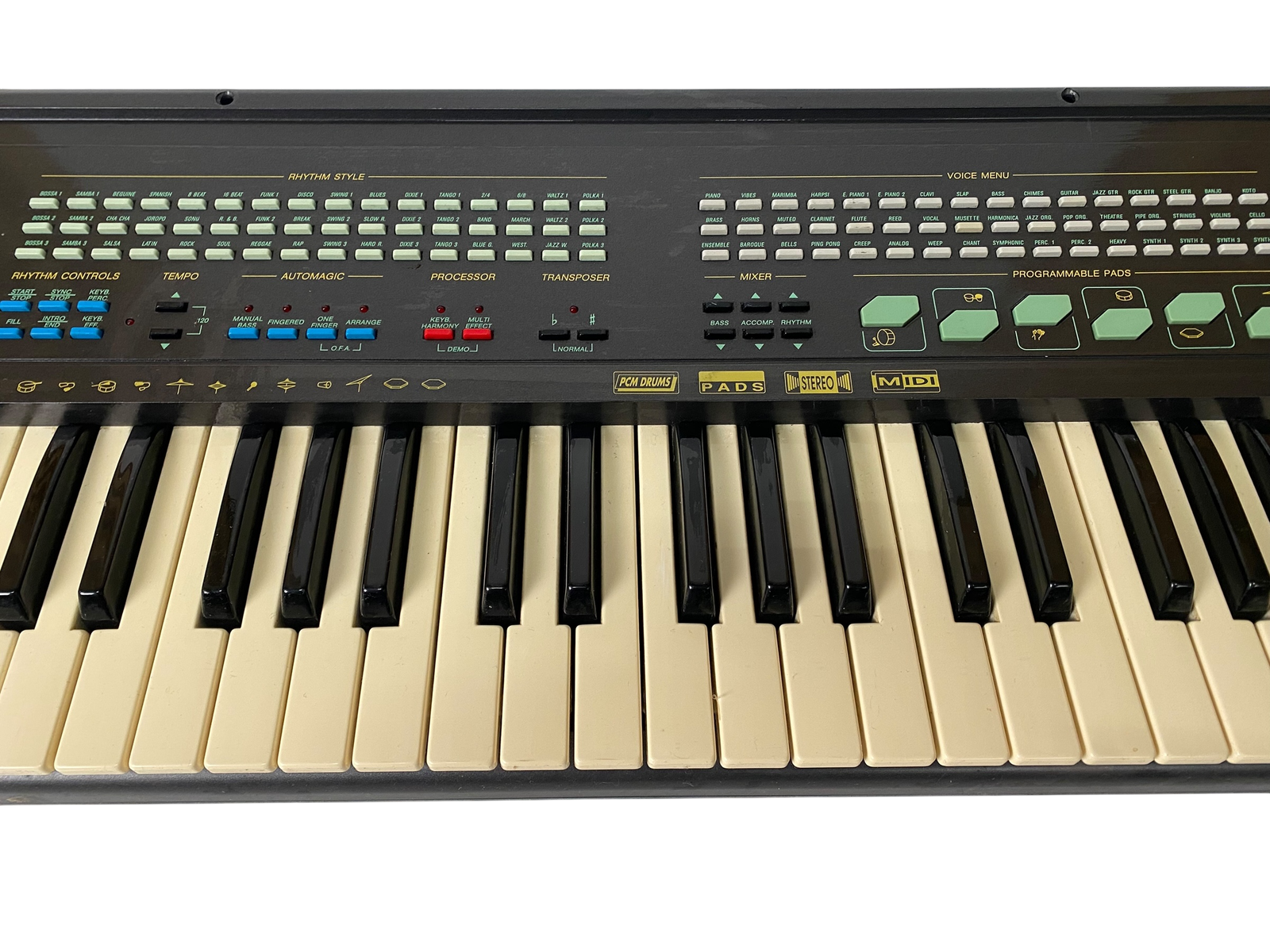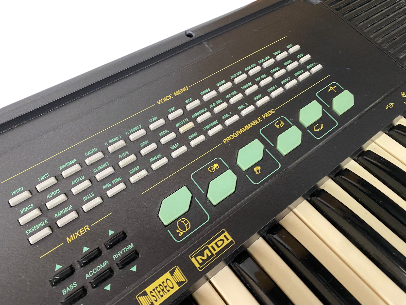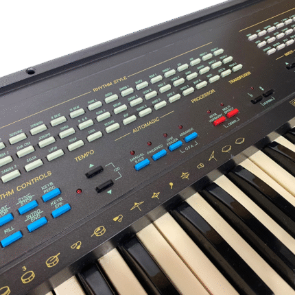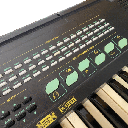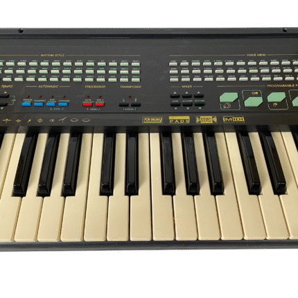 Sjarmerende preset-keyboard fra sent 80-tall, med MIDI inn/ut, RCA L/R og jack. Strømforsyning inkludert.