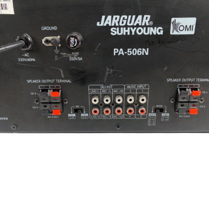 The Jarguar Suhyoung PA-506N is a multi-channel public address (PA) amplifier, likely designed for professional audio applications such as public announcements, live events, karaoke systems, or small venues. Manufactured by Suhyoung Electronics Co., Ltd., a South Korean company known for producing audio equipment, this model appears to be a rack-mountable unit tailored for versatility and durability. The branding «Jarguar» (possibly a stylized or typo variant of «Jaguar») suggests a premium or robust design, though specific documentation is scarce, indicating it may be a niche or older model.