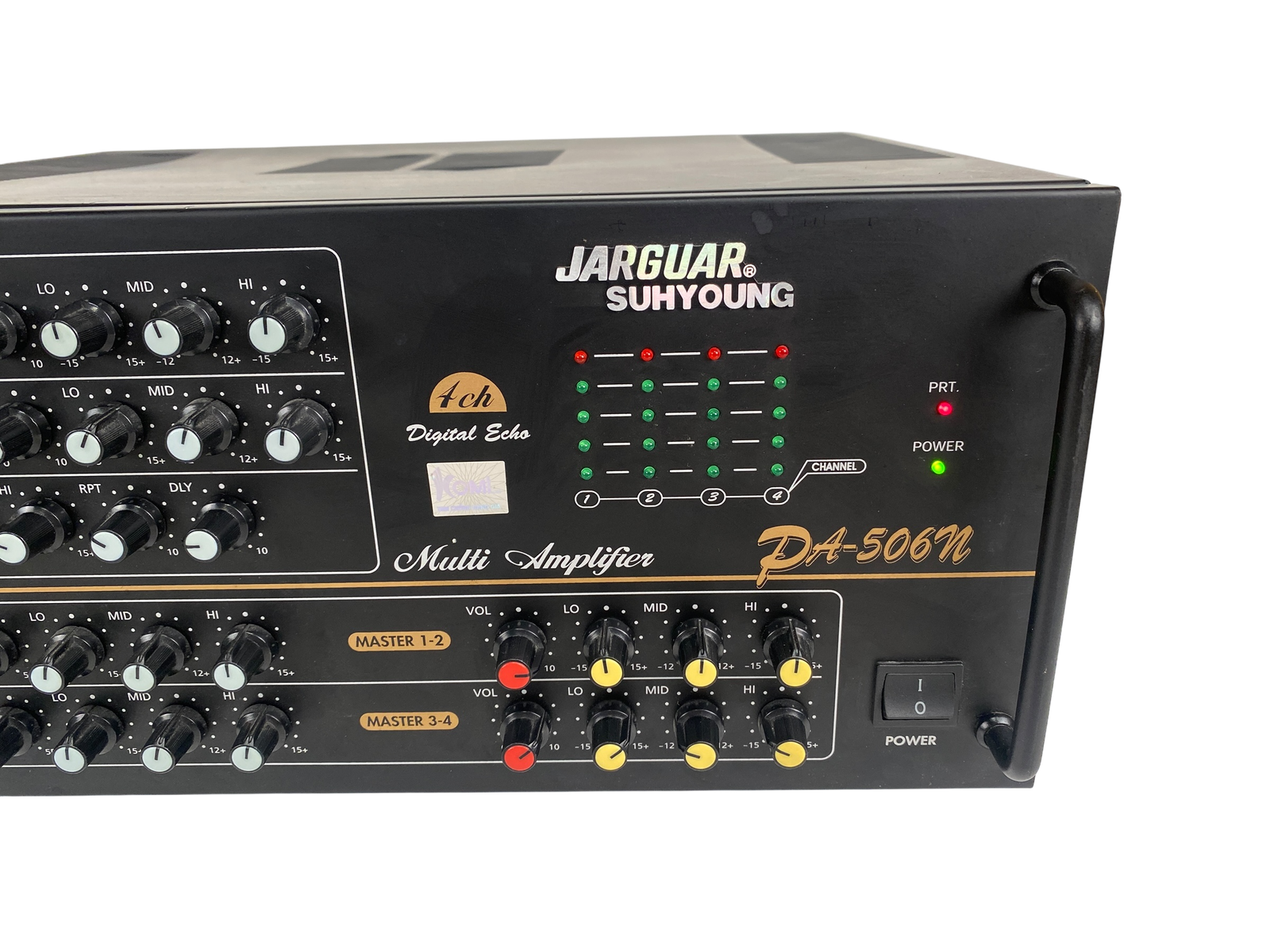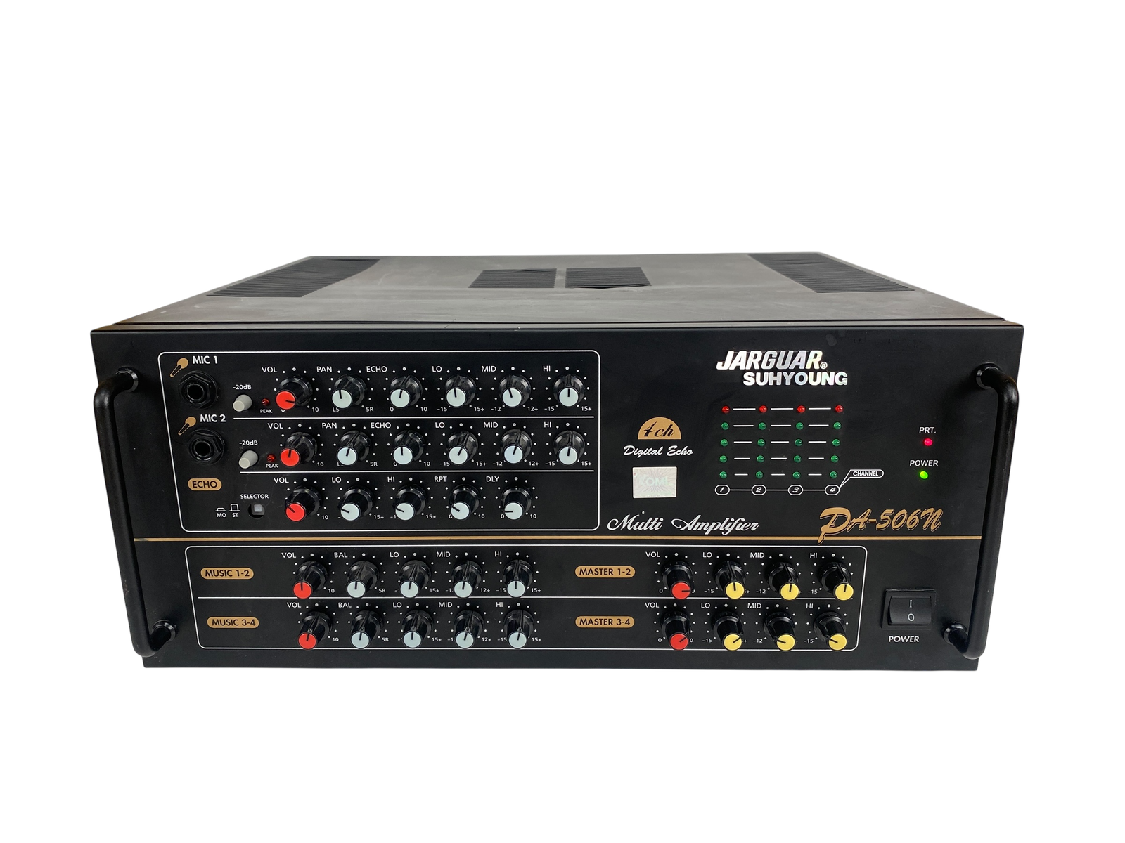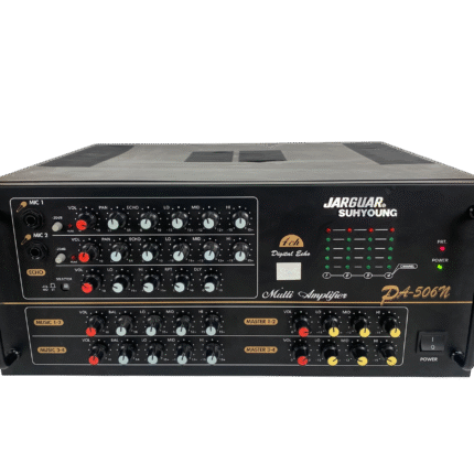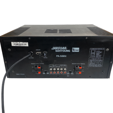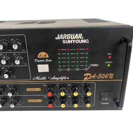 The Jarguar Suhyoung PA-506N is a versatile multi-channel PA amplifier designed for professional audio use, featuring 4 music inputs and 2 microphone channels with individual EQ and echo controls. Ideal for karaoke, live events, or public announcements, it includes digital echo effects, speaker terminals for 4-16 ohm loads, and a rack-mountable metal chassis.