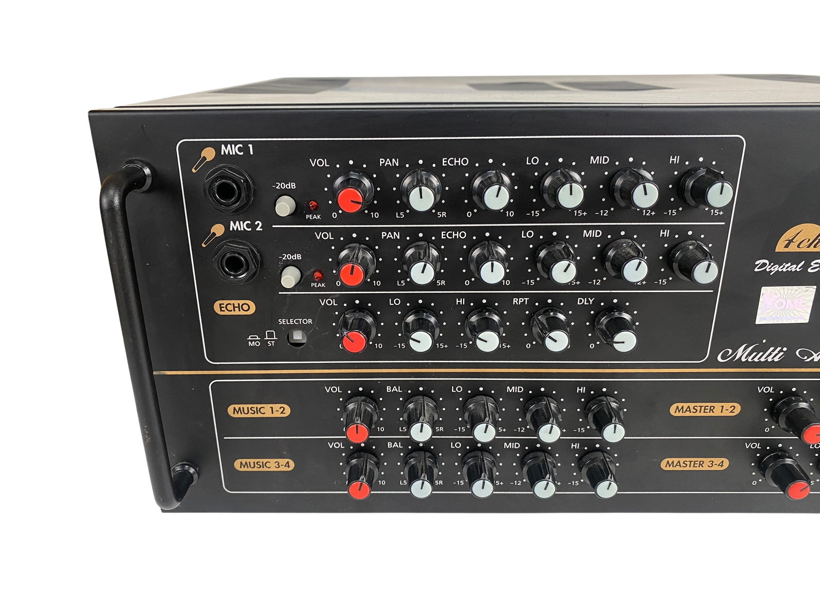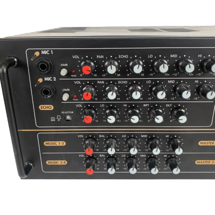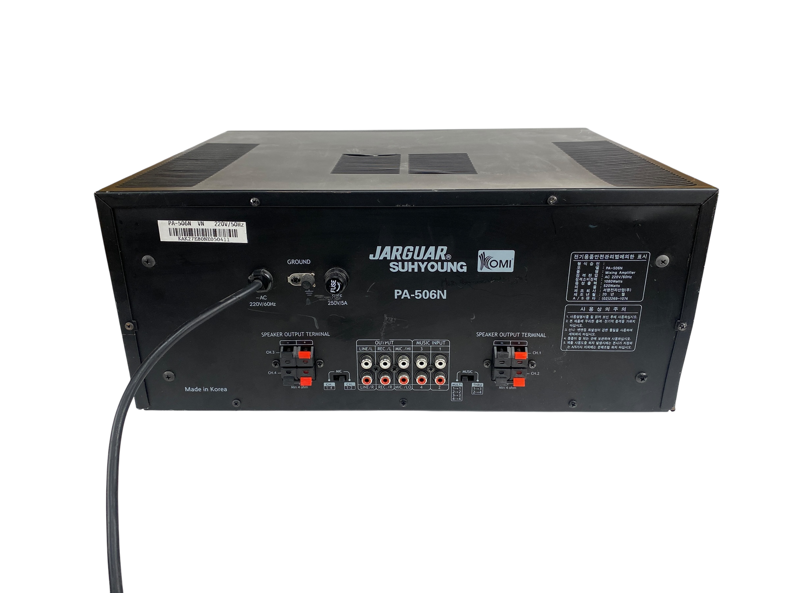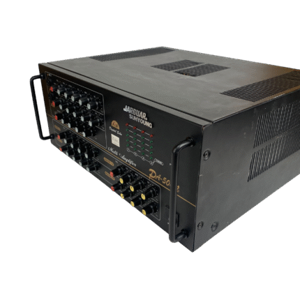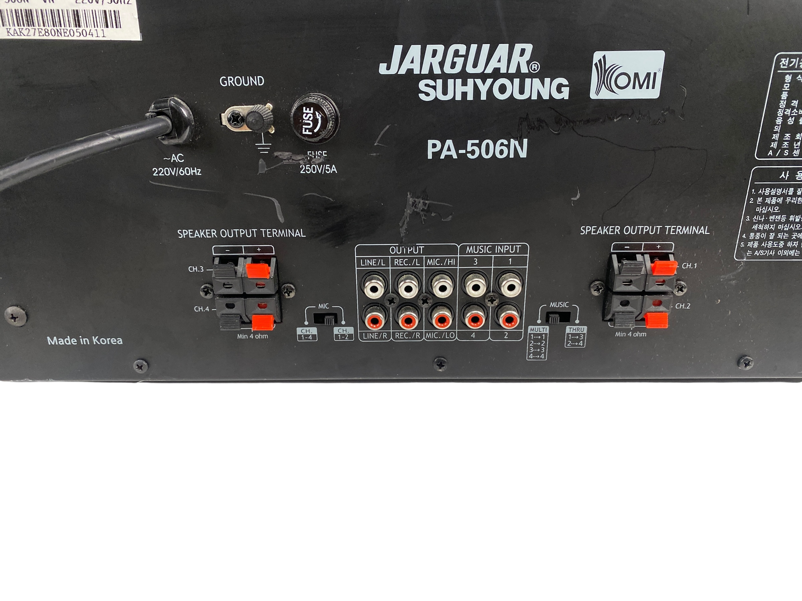 The Jarguar Suhyoung PA-506N is a versatile multi-channel PA amplifier designed for professional audio use, featuring 4 music inputs and 2 microphone channels with individual EQ and echo controls. Ideal for karaoke, live events, or public announcements, it includes digital echo effects, speaker terminals for 4-16 ohm loads, and a rack-mountable metal chassis.