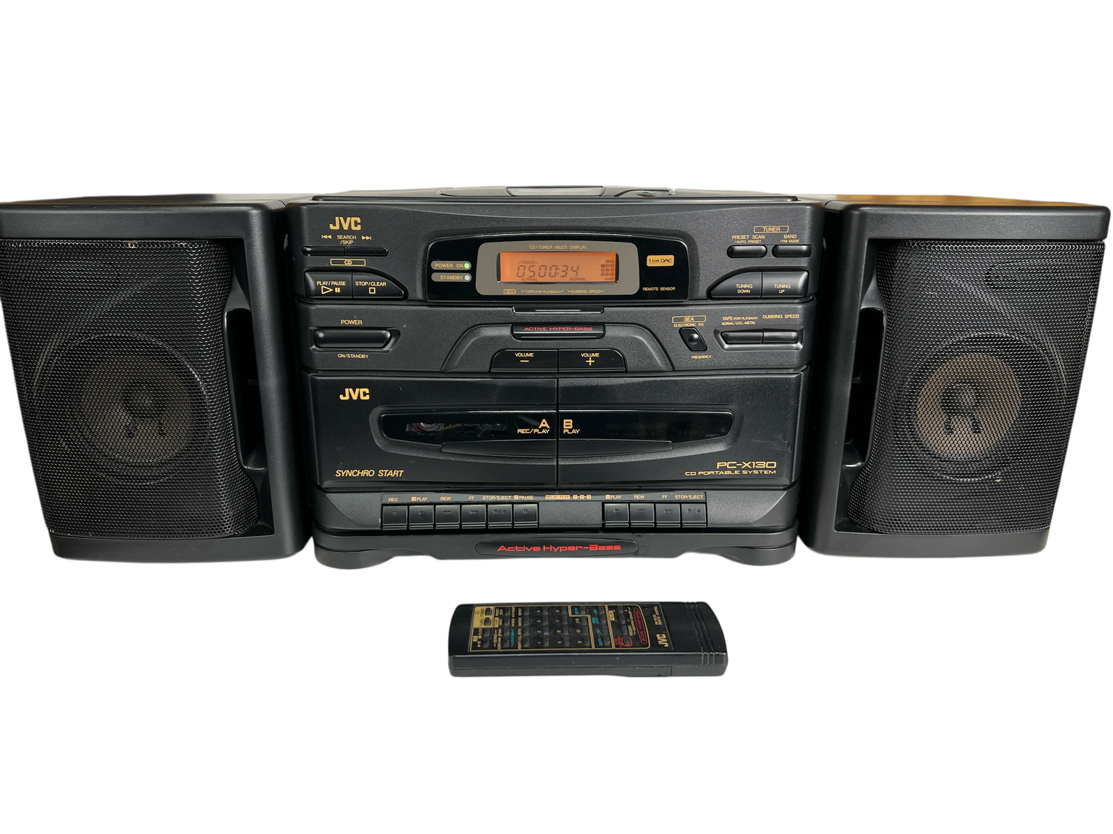 Med sin brede front, integrerte stereo-høyttalere og medfølgende fjernkontroll representerer PC-X130 overgangen fra klassiske kassett-boomboxer til CD-basert hverdagslyd. Et opplagt valg for dem som vil ha et autentisk stykke 90-talls forbrukerelektronikk – enten til bruk, samling, rekvisitt eller interiør.