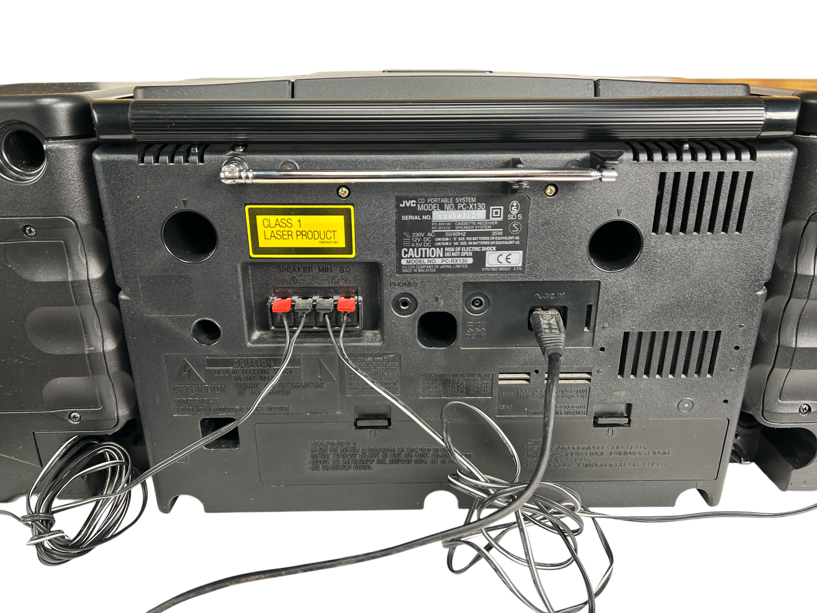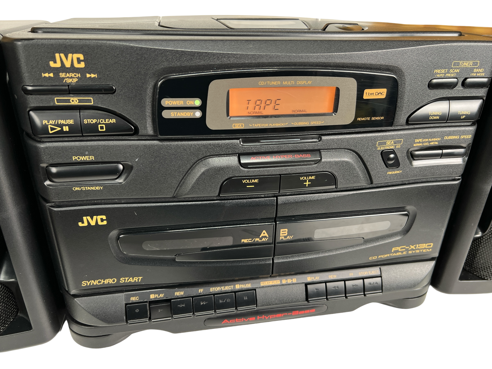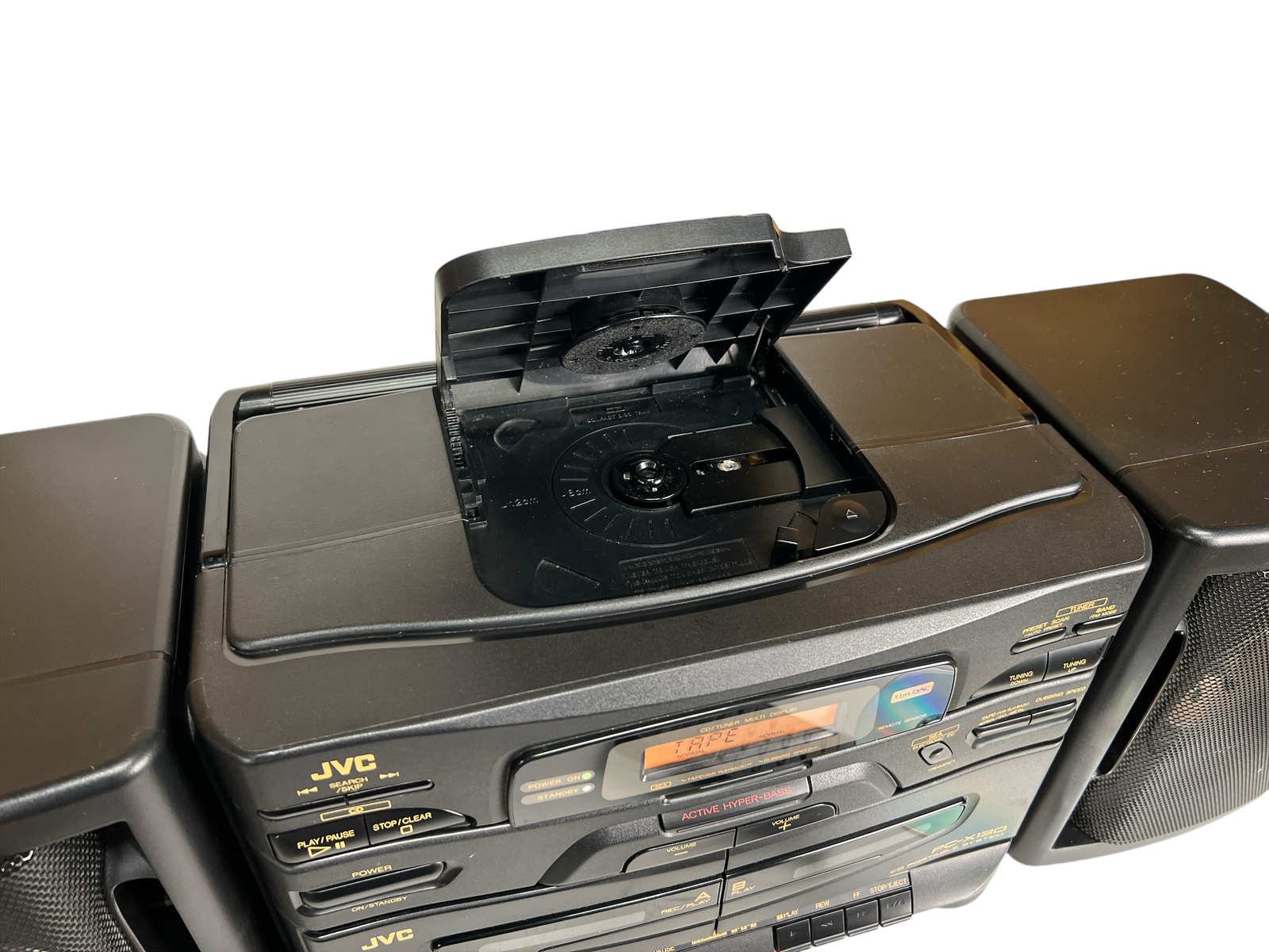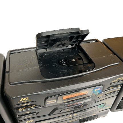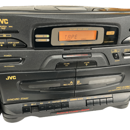 JVC PC-X130 er en kompakt, men markant CD-boombox produsert rundt 1993, i perioden da CD-formatet for alvor hadde funnet veien inn i bærbare musikkanlegg. Dette er en typisk tidlig-90-talls alt-i-ett-løsning som kombinerer CD-spiller, kassettspiller og FM/AM-radio i ett og samme kabinett, med tydelig fokus på brukervennlighet og mobil musikk.