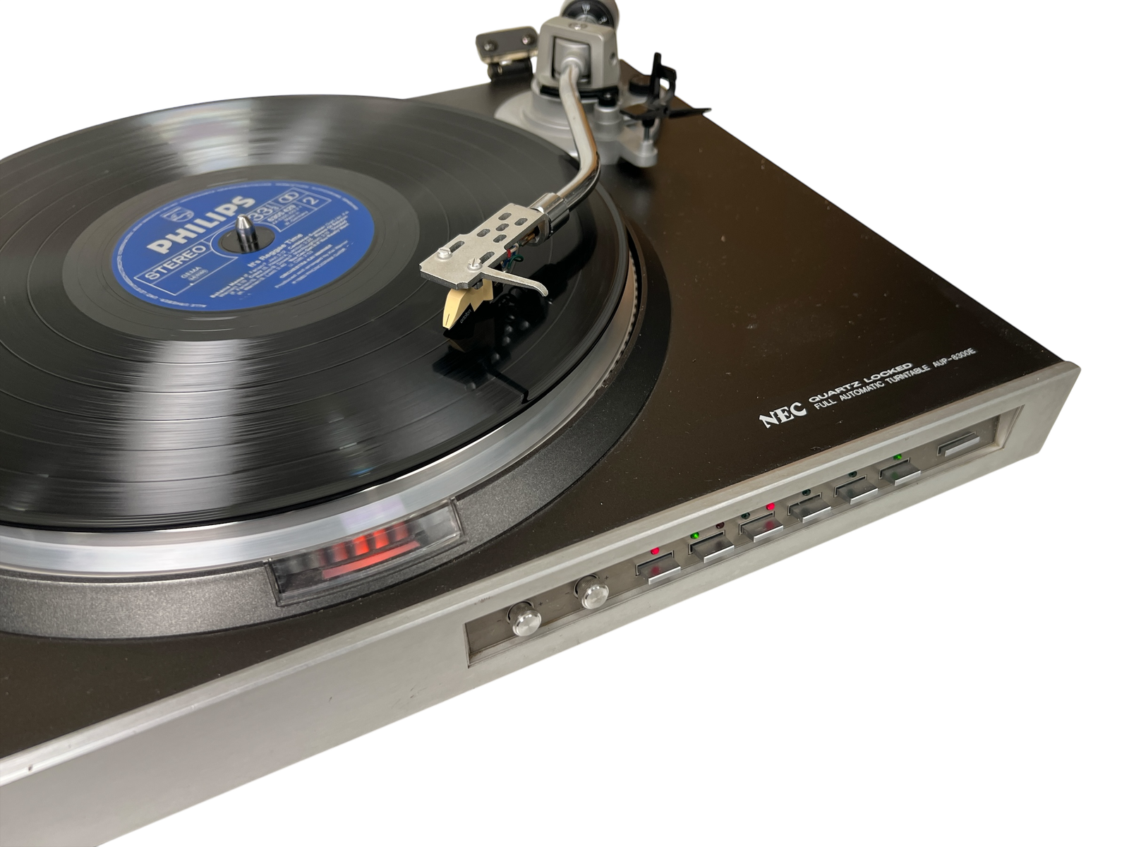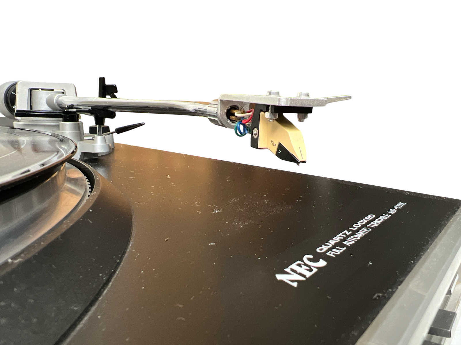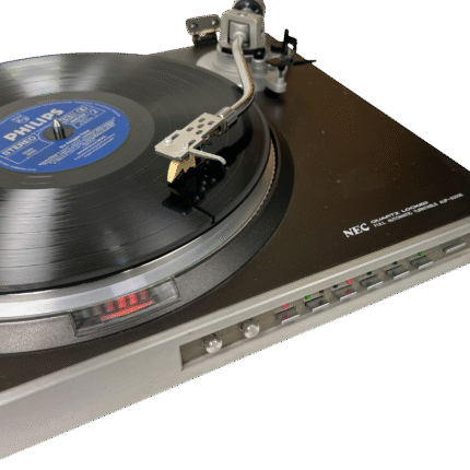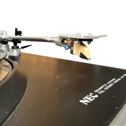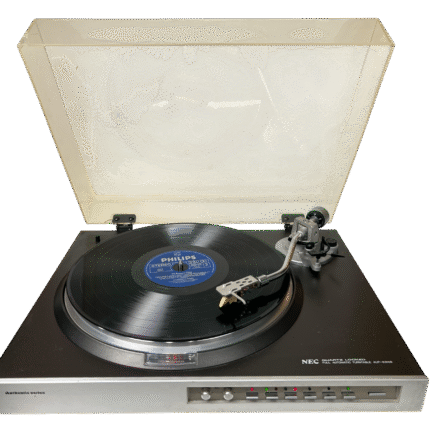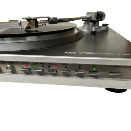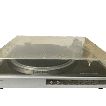 NEC AUP-8300E direktedrevet, helautomatisk platespiller fra slutten av 1970-/tidlig 1980-tall. Quartz-styrt direct drive-motor, rett tonearm med standard ½» pickupfeste og fokus på stabil hastighet fremfor fiksfakseri. Klassisk japansk konstruksjon i normal størrelse og vekt for perioden. Slitent og misfarget lokk – ellers helt i orden. Leveres med Ortofon TM 7 pickup, en velrenommert MM-pickup som ofte regnes som forgjengeren til dagens Ortofon 2M Red. TM 7 er kjent for balansert og presis lydgjengivelse, og ny stift kan fortsatt skaffes på nettet om man ønsker å bytte den (brukstid på den som sitter på er uviss, men den låter veldig bra).
