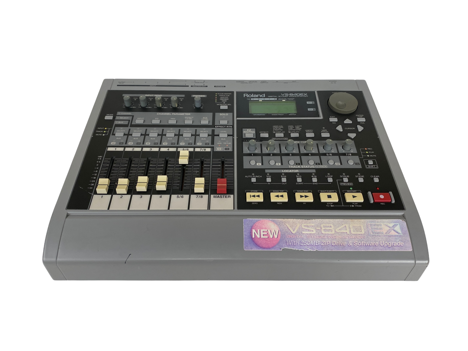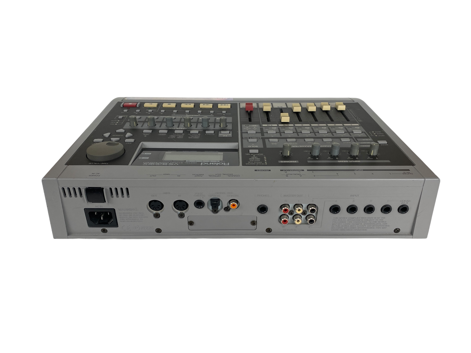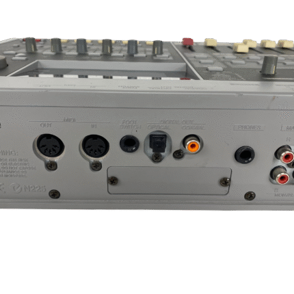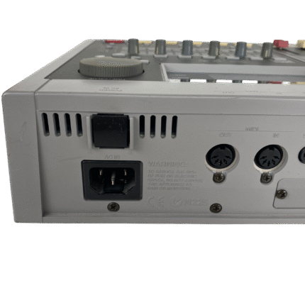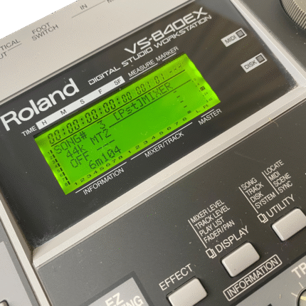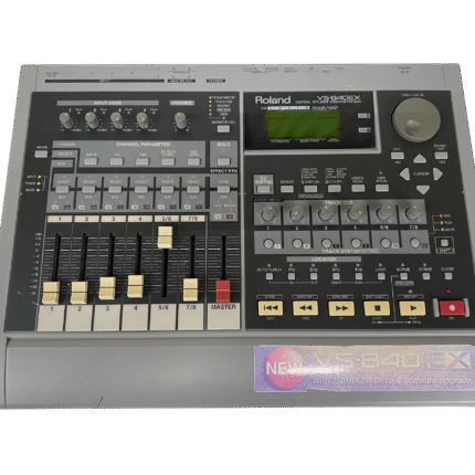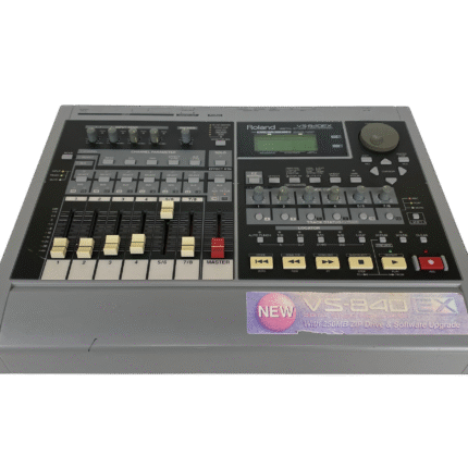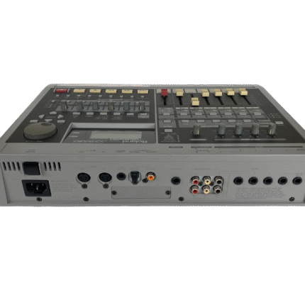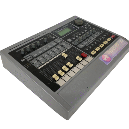 8-track digital recording workstation, 4-track simultaneous recording, 250MB Zip drive, 200 songs per disk, 64 virtual tracks (8 tracks x 8 V-tracks), 16-bit audio, 44.1kHz sampling rate, 2-band EQ per channel, 2 effects processors, MIDI in/out, SCSI port, 1/4″ guitar input, RCA inputs/outputs, headphone jack, 12V DC power, weight 4.5 kg.