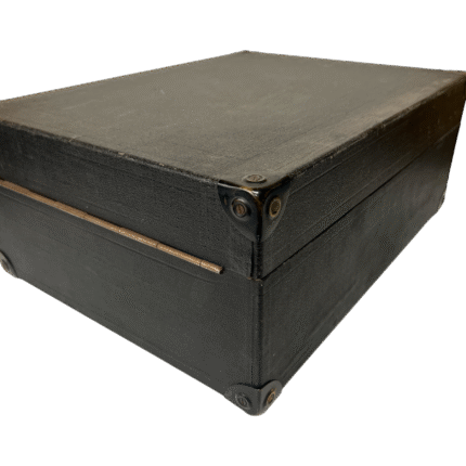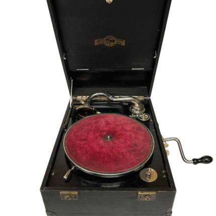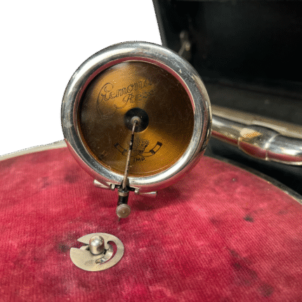 Bærbar mekanisk grammofon i koffertutgave, produsert i perioden da sveivdrevne platespillere var standard i hjem og på reise. Spilleren har innebygd horn, manuell sveiv, og er beregnet for 78-plater. Typisk solid konstruksjon med metalltonearm og filtmattert tallerken.