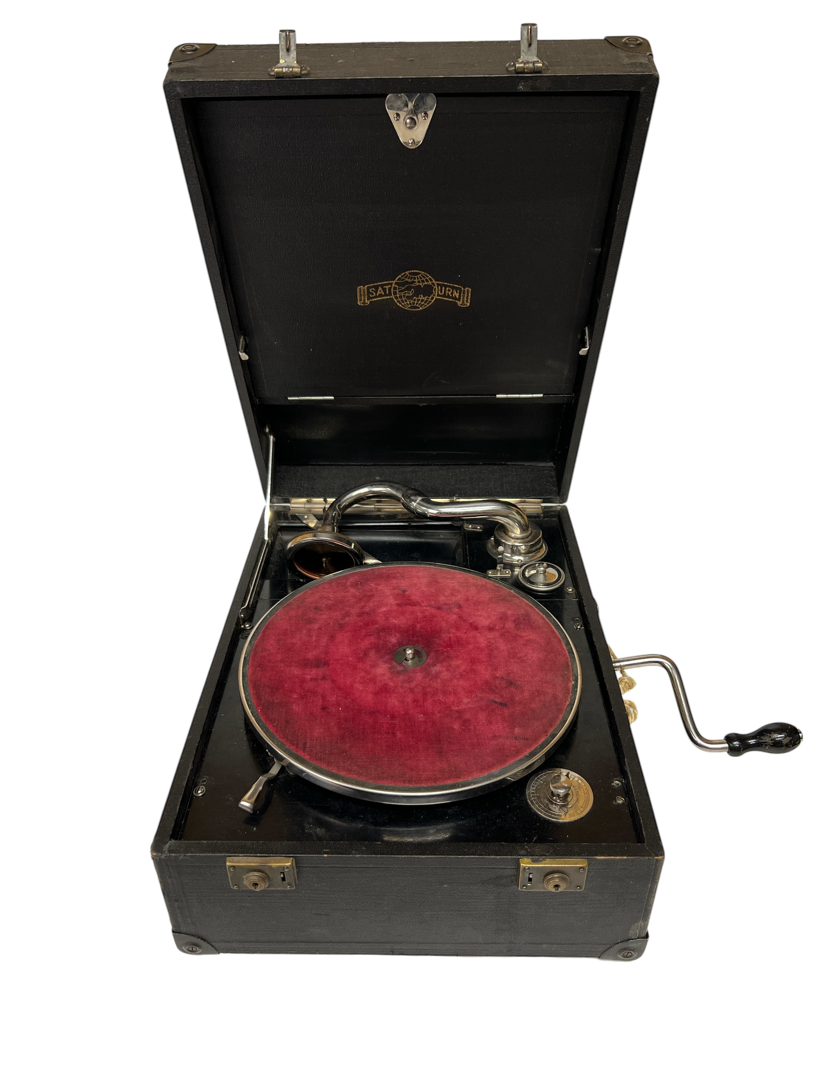 Bærbar Saturn mekanisk grammofon i koffertutgave, beregnet for 78-plater og drevet med manuell sveiv. Klassisk mellomkrigsdesign med innebygd horn og filtmattert tallerken. Et tidstypisk eksempel på tidlig, strømfri musikkavspilling.