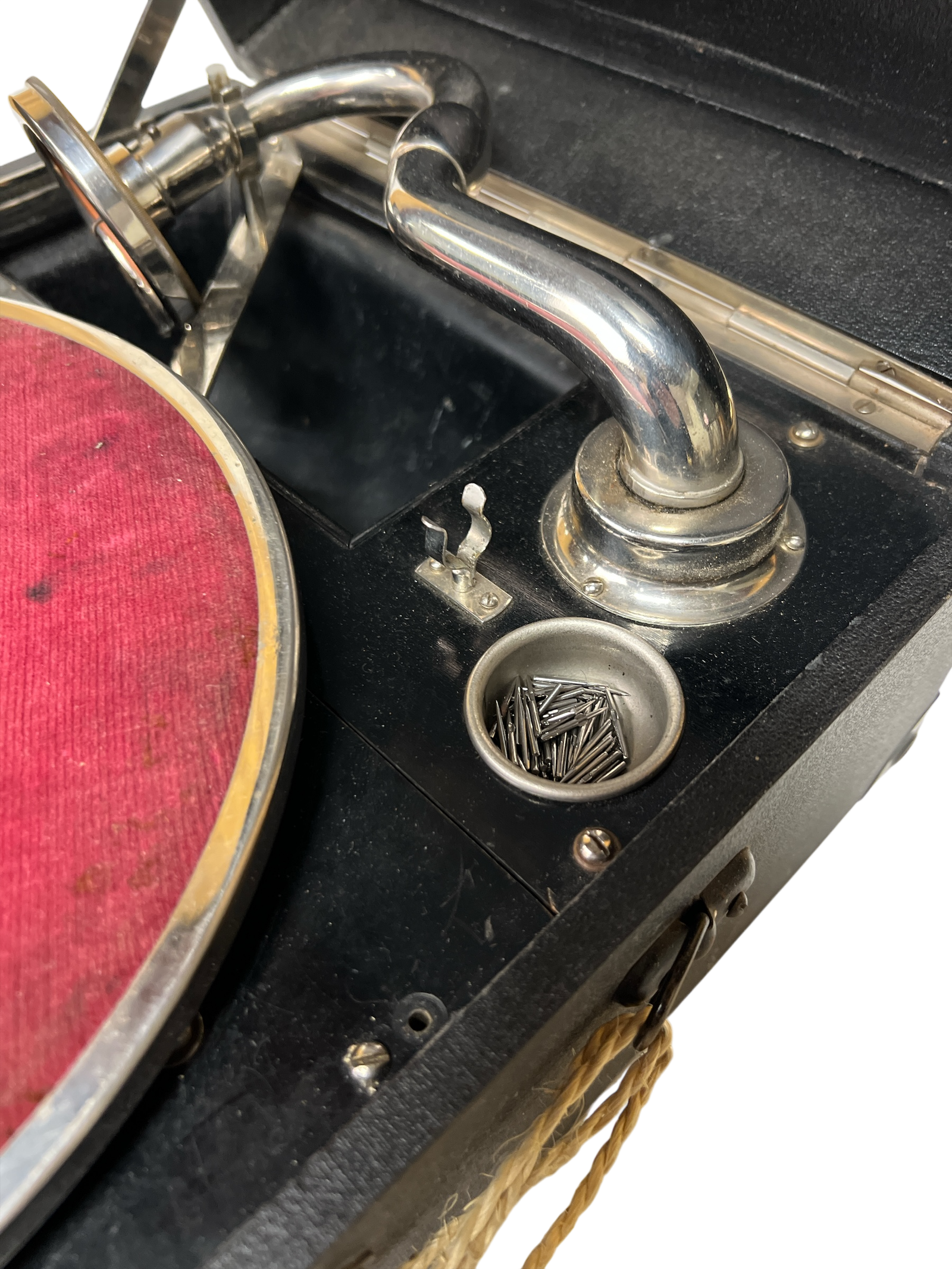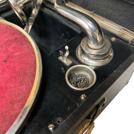 Dette er en klassisk representant for mellomkrigstidens bærbare grammofoner, laget for bruk uten strøm og enkel transport i lukket koffert.